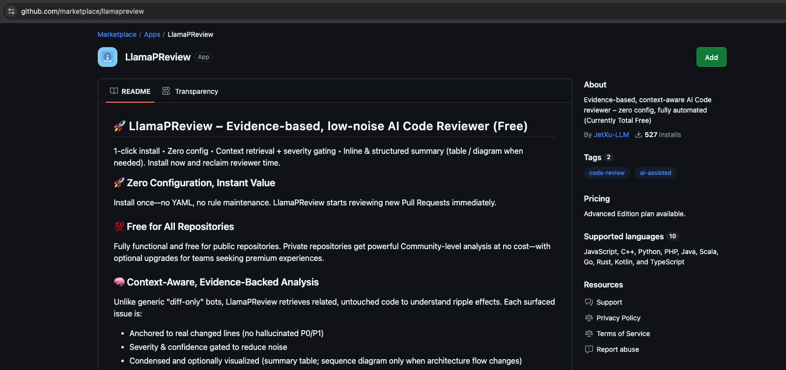 By April 2026, LlamaPReview had reached 527 active installs on GitHub Marketplace.