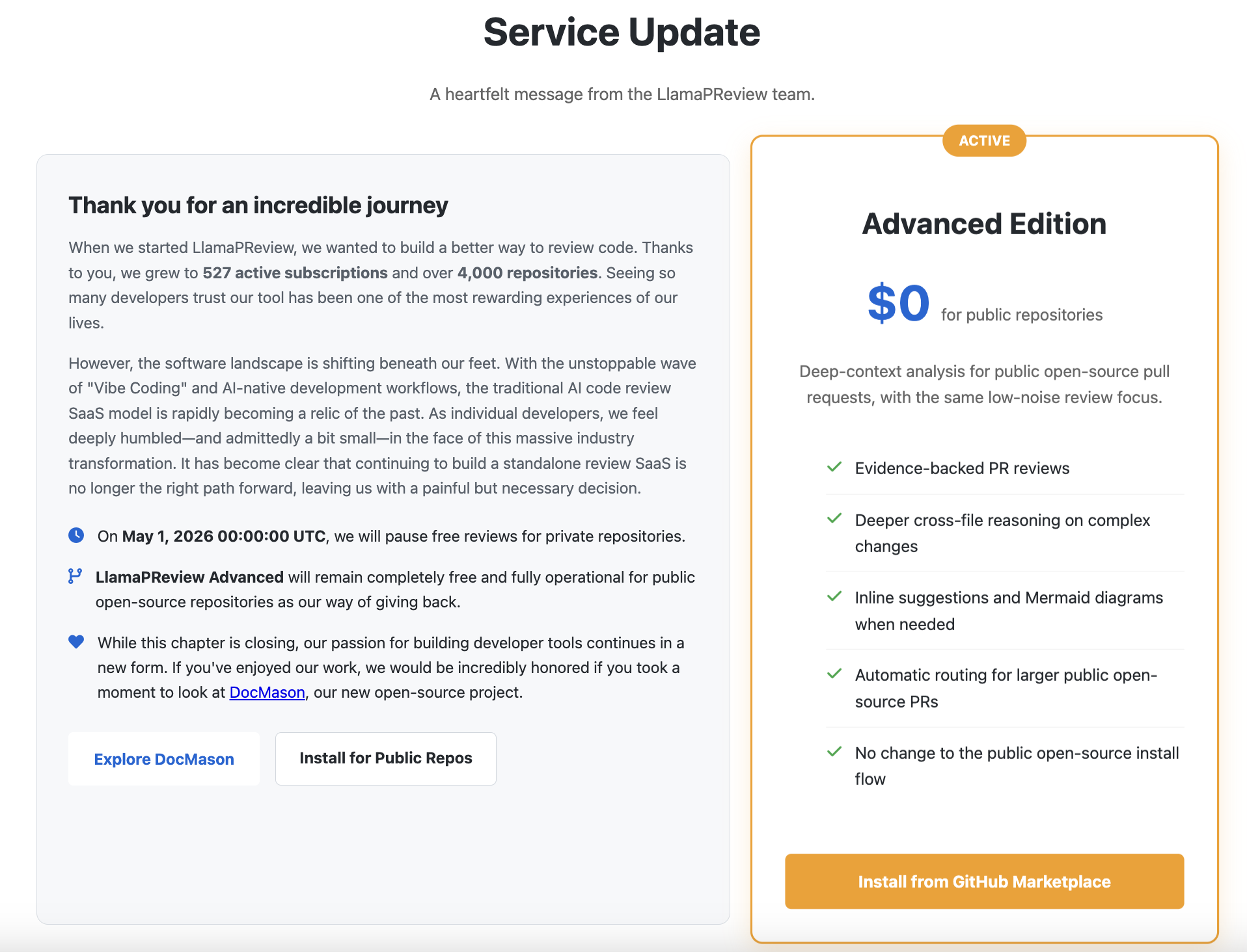 The public open-source tier of LlamaPReview will remain completely free and operational. As for the private SaaS side, it is essentially a turnkey Micro-SaaS with an active user base. If someone in the community wants to take the keys and run with it, my DMs are open.